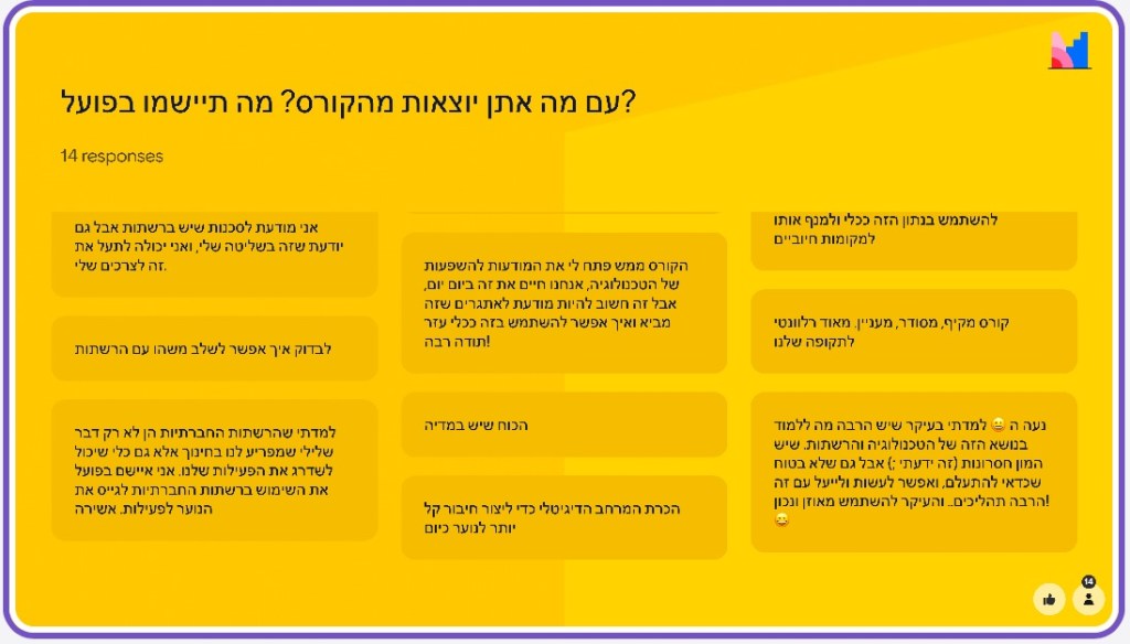 📸 בתמונות תוכלו לראות את התובנות שכתבו הסטודנטיות בסיום הקורס – מחשבות עמוקות על המקום של החינוך הבלתי פורמלי בעולם הדיגיטלי, לצד רעיונות יישומיים לשטח. מחכה כבר לקרוא את העבודות ותוצרי הסיכום בקורס.