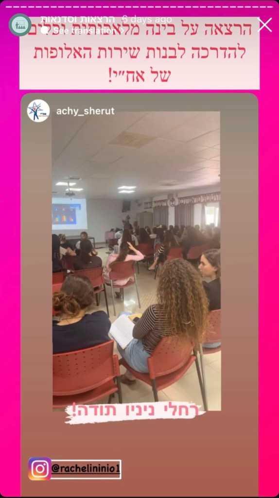 ״נכון שאלת אותנו על רשתות?״ היא המשיכה. ״אין לי פרופיל באף רשת. איך אהיה בקשר עם בני הנוער?״. ״תפתחי פרופיל ייעודי לצורך התפקיד שלך. שם תוכלי להיות בקשר עם בני הנוער, לשתף מה קורה, וכמובן להגביל- שימי הגבלה של זמן, שעה, שעה וחצי ביום שזה הזמן שאת שם- מעלה תוכן, מגיבה, משתפת וזהו- ברגע שההתראה קפצה, עוצרים. בלי לרמות, קאט. תמשיכי מחר. ובסוף? תהיי את. תהיי אותנטית, כנה. תנסי לראות אותם באמת. זה מה שכולנו ובמיוחד בני הנוער מחפשים ויודעים לזהות גם ממרחקים. תהיי מי שאת״. בתמונה- אני אני ונהנית מכל רגע בצילום מסך מתוך הסטורי של אח״י. מיישמת את הכלים מההרצאה🥰