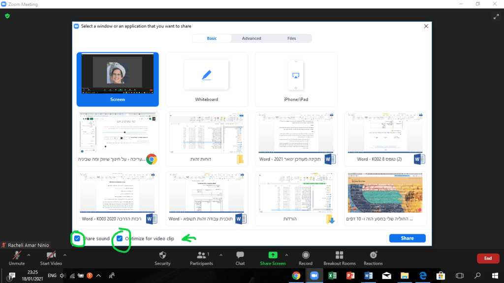 - לצד תיבת הסימון של שמע בזום שאותה לא לשכוח לסמן ( Share video sound), יש תיבה נוספת- Optimize screen sharing for video clip